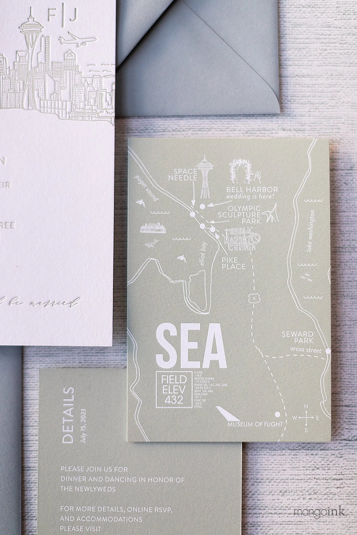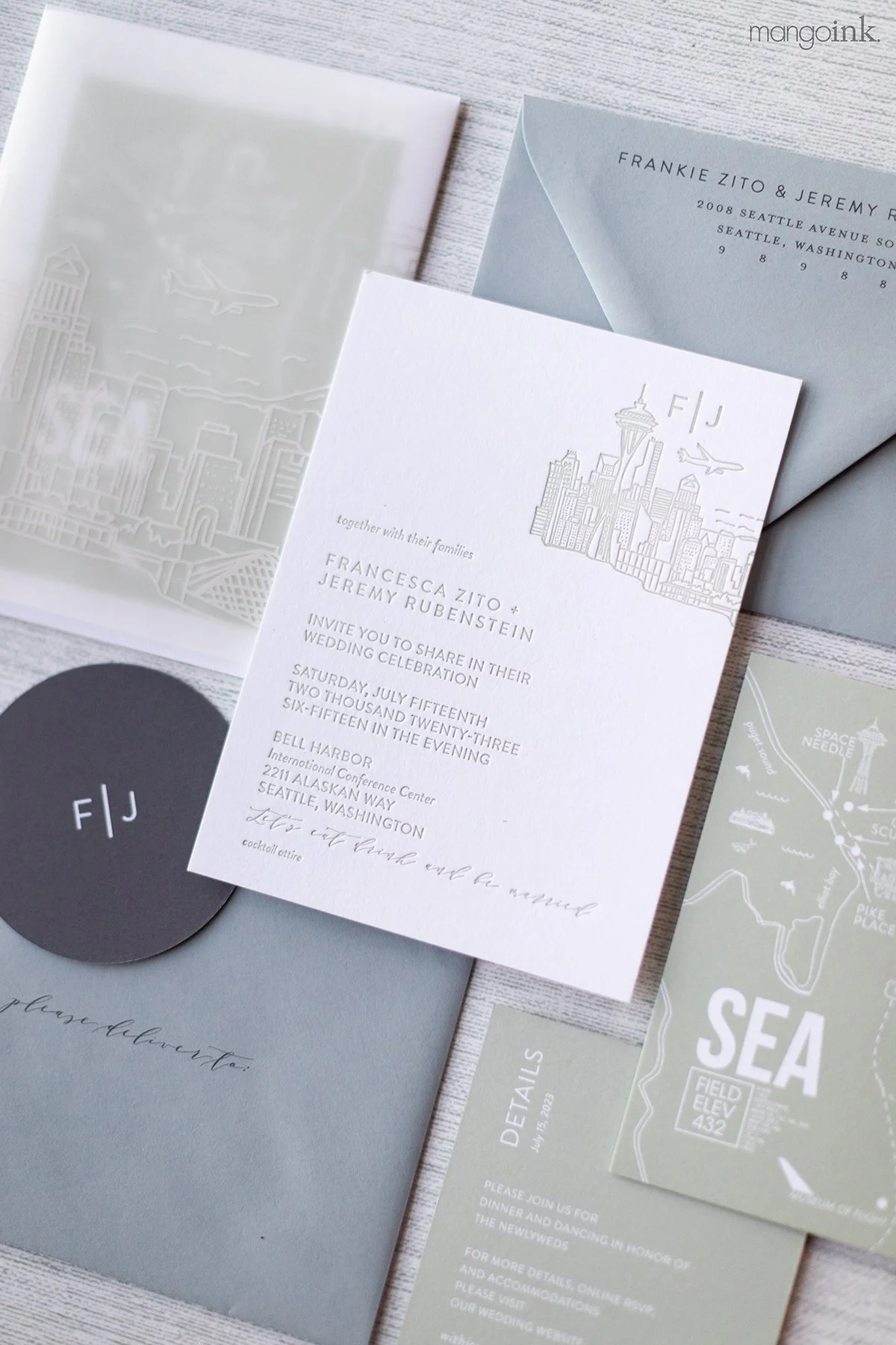 Designed for couples whose love story is full of adventure, this modern wedding invitation suite is inspired by the magic of travel and the places that feel like home. Featuring clean lines, bold shapes, and a sleek vellum wrap, the Frankie suite blends aviation-inspired details, a custom map, and the iconic Seattle skyline for a personal touch that feels unmistakably yours.