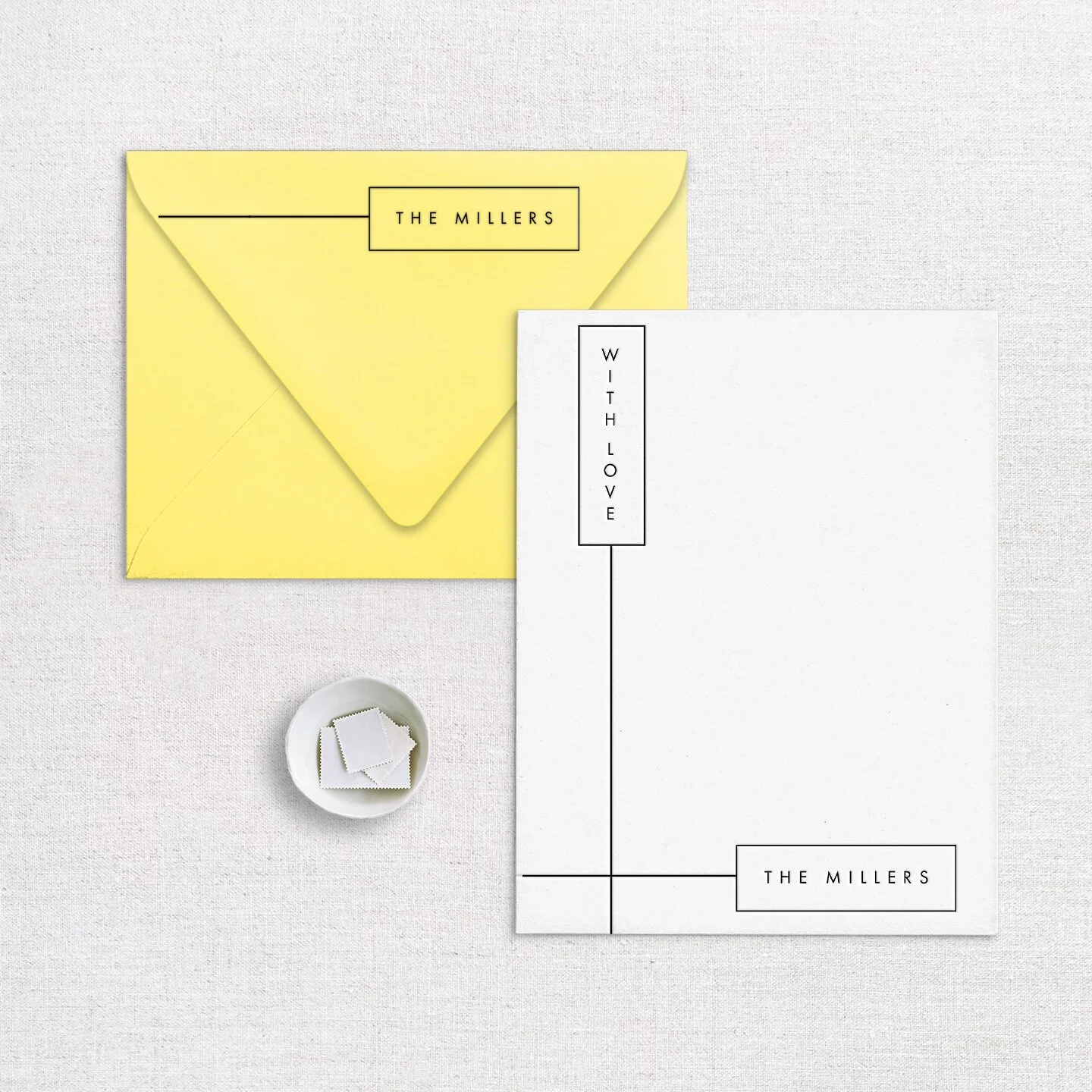 A really fun modern design for your gorgeous custom Letterpress Stationery! Trust us when we say, these are incredible! We can’t wait for you to hold these in your hands. The tree-free cotton, cardstock is so luxurious, the deep impression of your name (or monogram/logo/design) pressed in with your choice of hand mixed inks, and the prettiest, euro flap envelopes that make them pop.